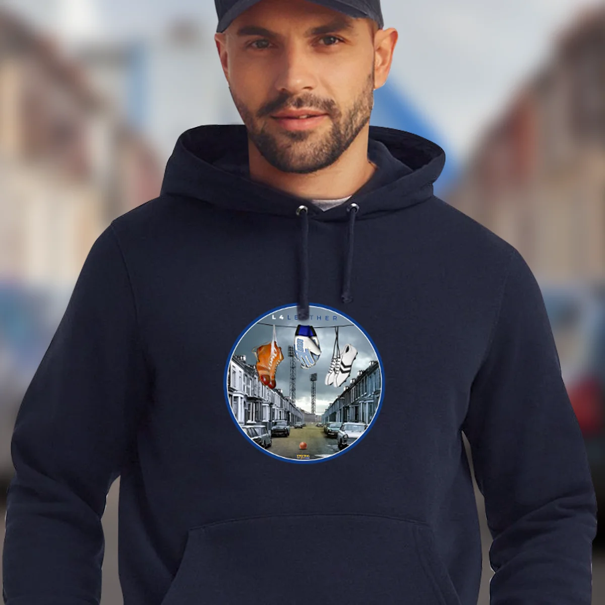 Set against the backdrop of the surrounding streets of Goodison Park with the old floodlights in the distance.