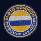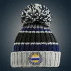 Embroidered emblem design on a heavyweight ribbed knit, bold three colour stripe design.
